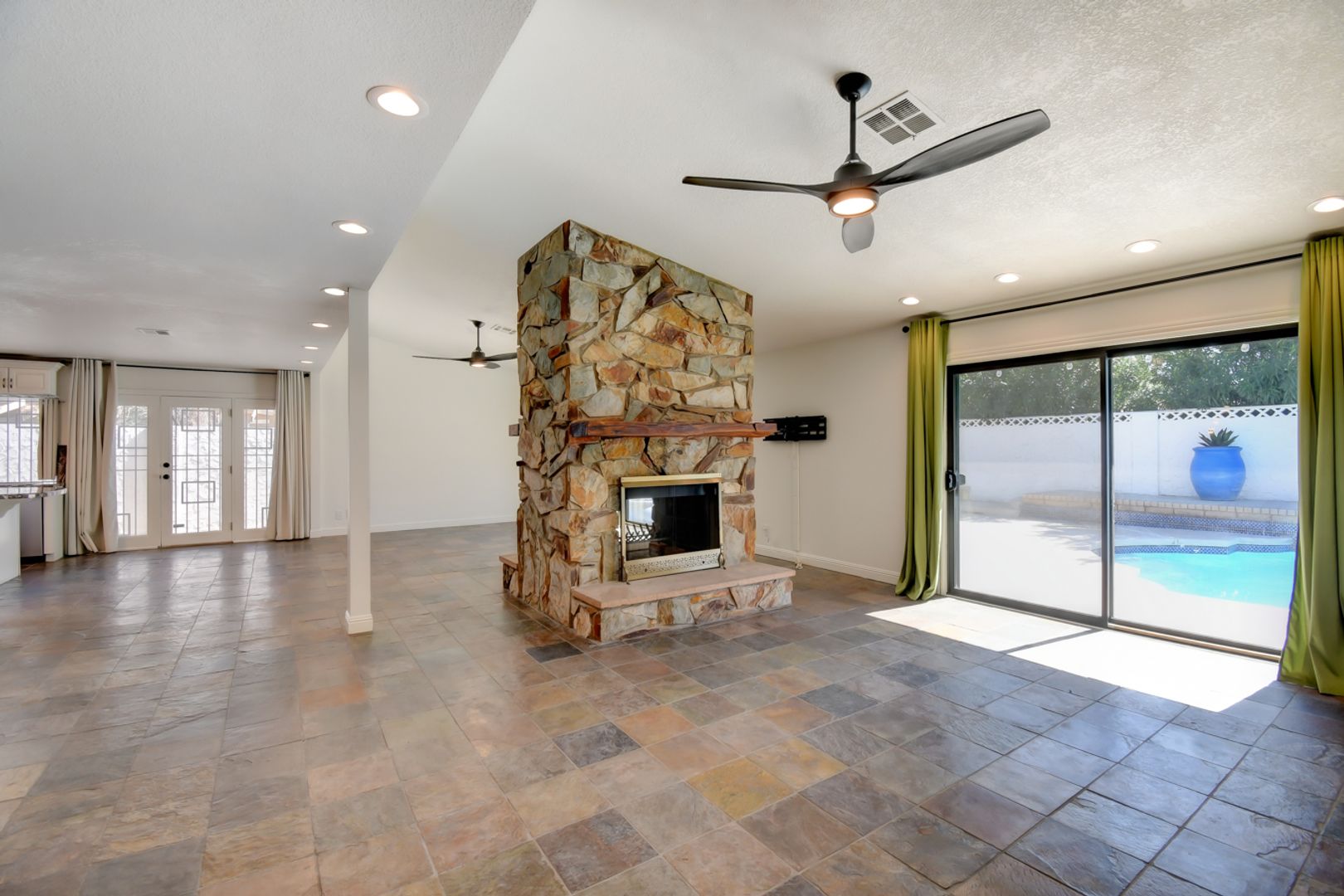 Rare and distinctive 3-bedroom, 2-bath home with a spacious open layout, perfect for comfortable living and entertaining. The large living area features a stunning floor-to-ceiling stone wood-burning fireplace, creating a warm focal point for the home.